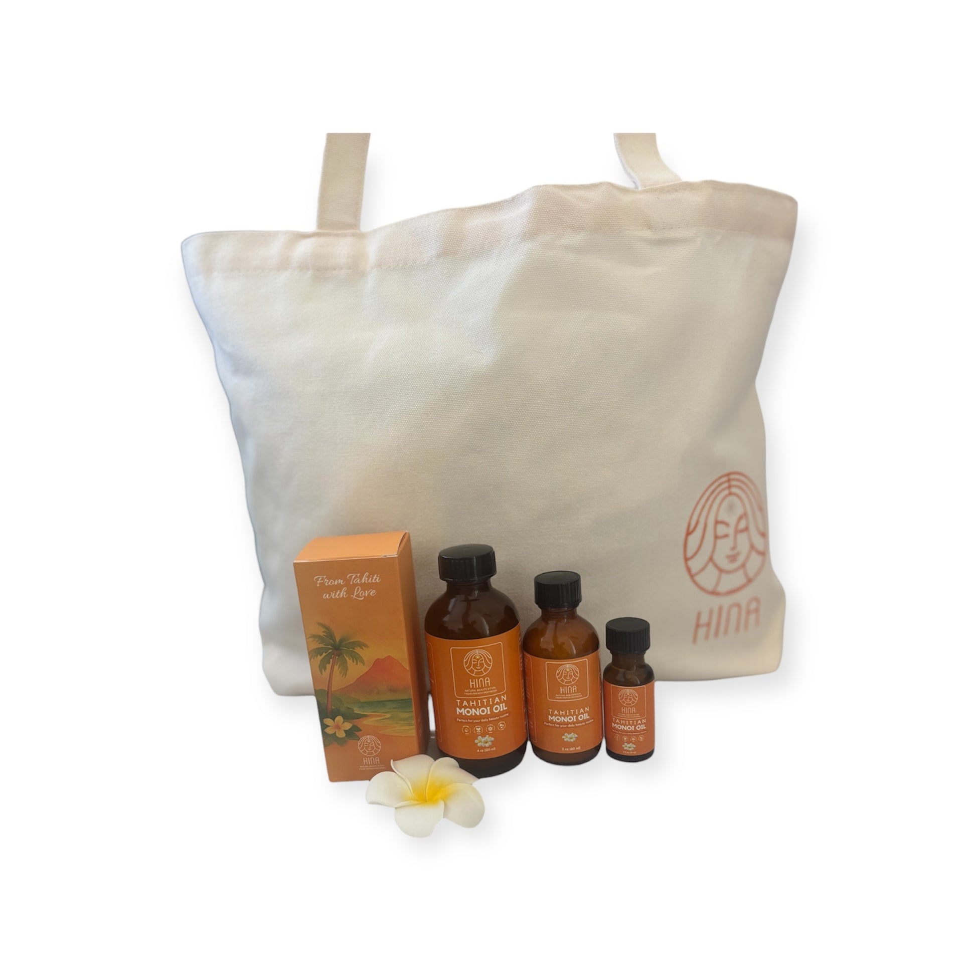 The Full Glow Complete Set + Beach Tote brings together everything you need for deeply nourished skin & hair, inspired by French Polynesia — plus our iconic HINA Beach Tote, included at a special price.
